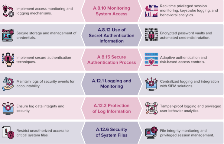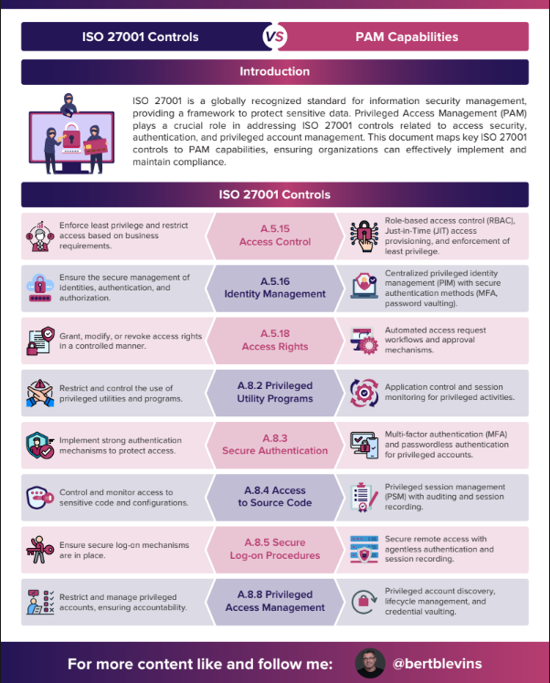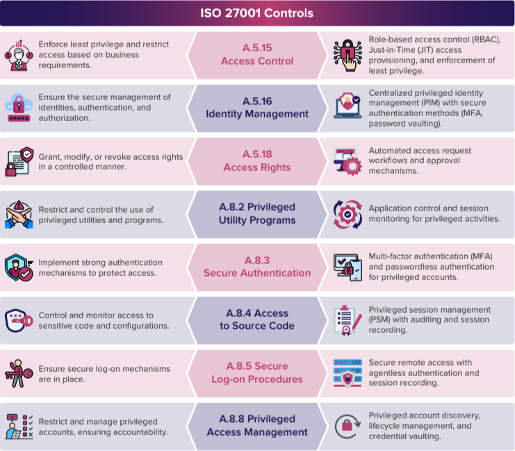ISO 27001 is a globally recognized standard for information security management, providing a framework to protect sensitive data. Privileged Access Management (PAM) plays a crucial role in addressing ISO 27001 controls related to access security, authentication, and privileged account management. This document maps key ISO 27001 controls to PAM capabilities, ensuring organizations can effectively implement and